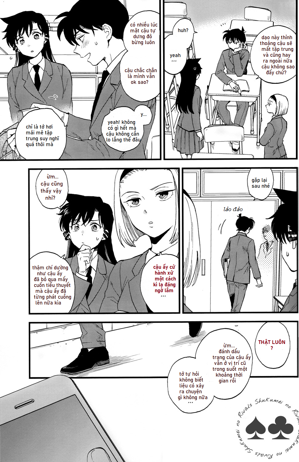 – Lời thoại nhân vật được phân chia đậm, nhạt và màu sắc khác nhau đồng nhất từ đầu đến cuối để các cậu dễ phân biệt nhất có thể